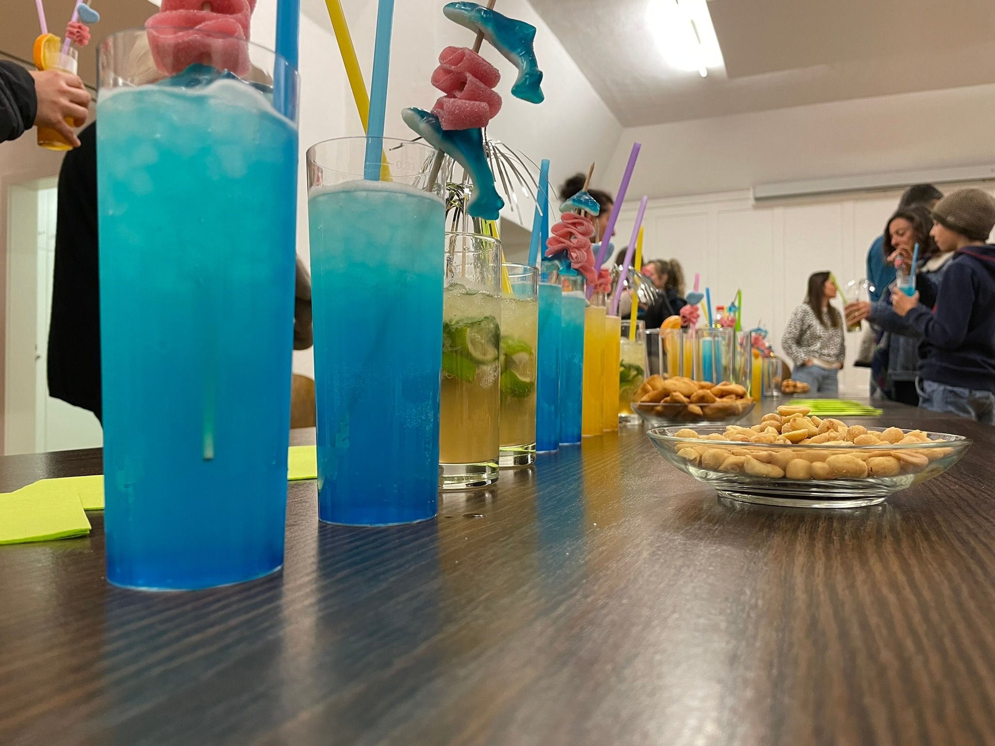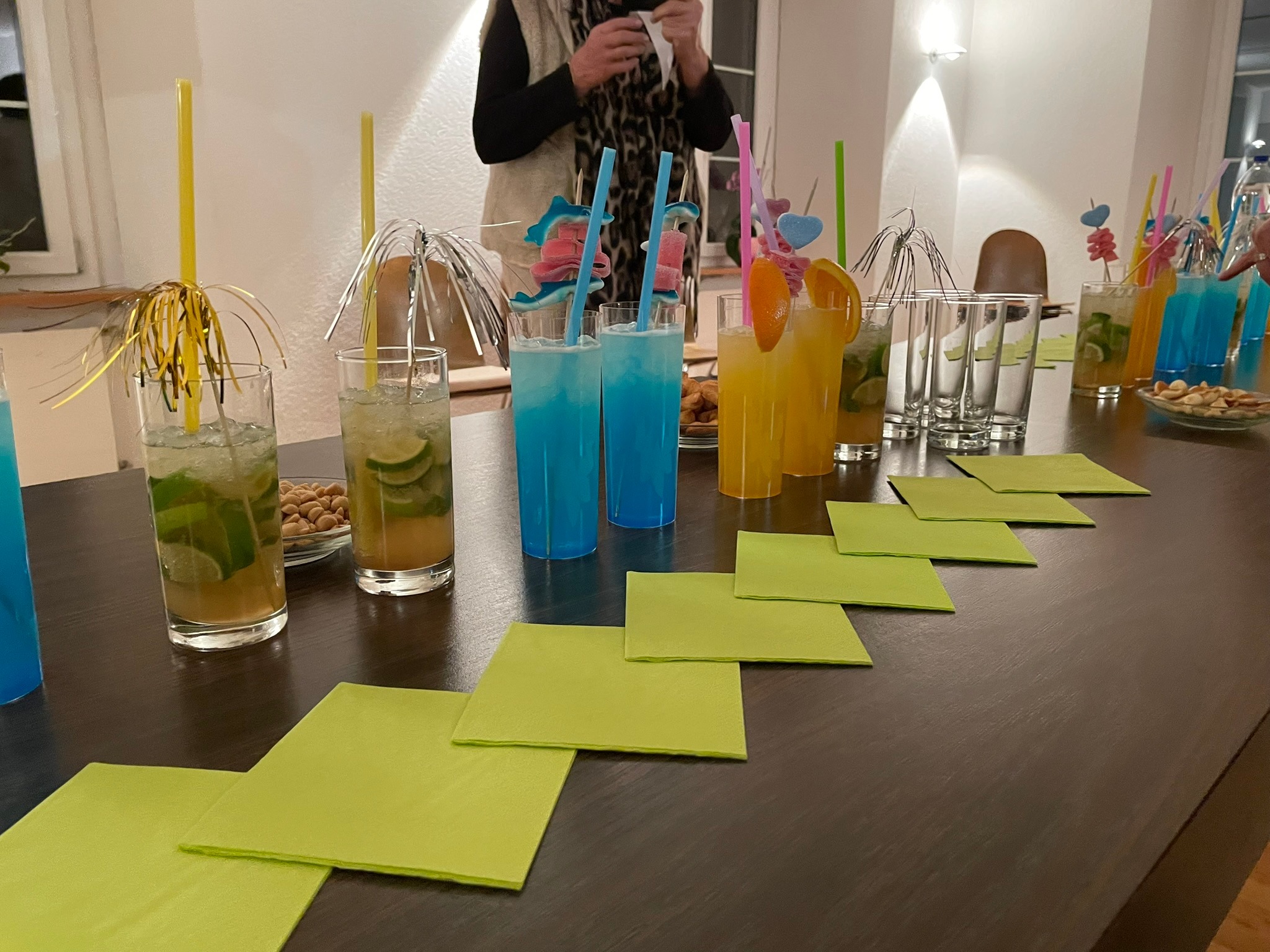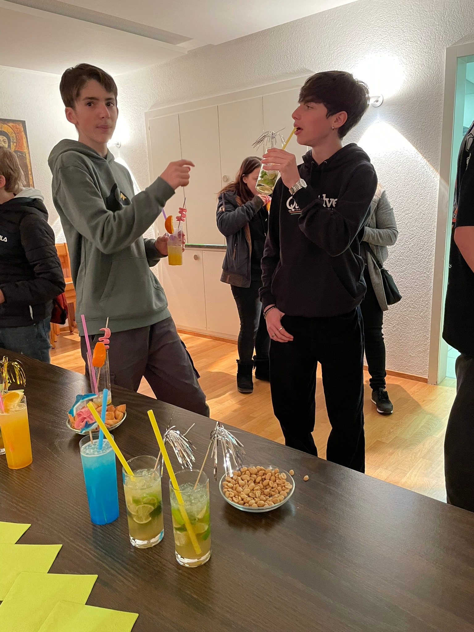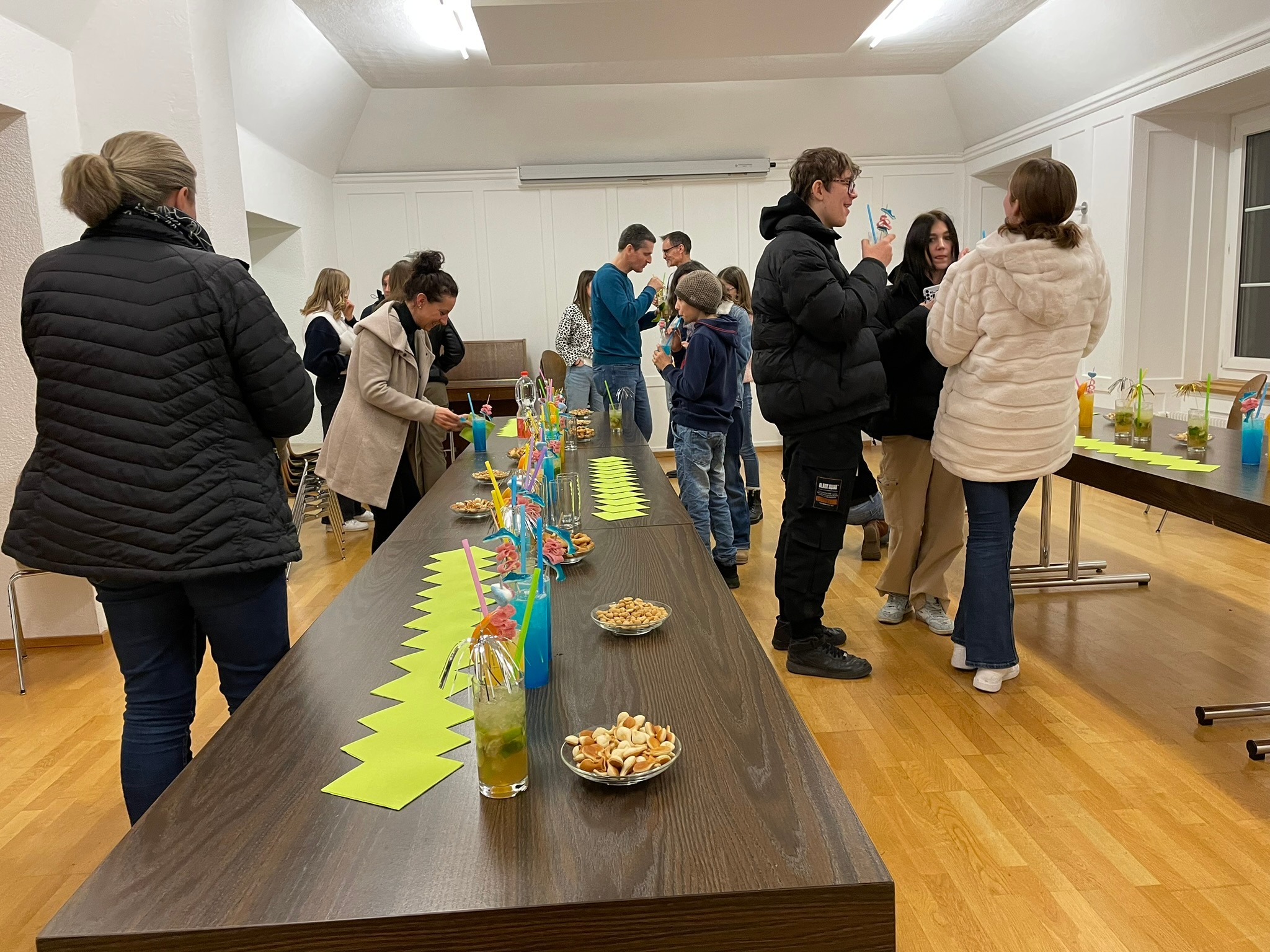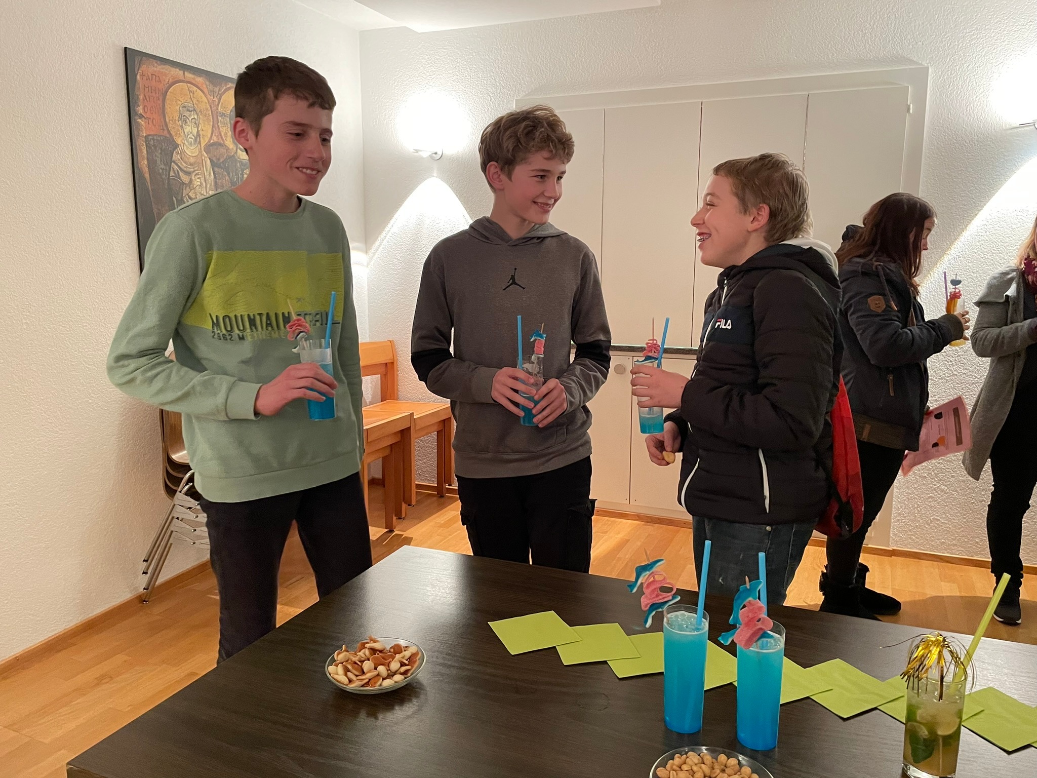 Nach dem Gottesdienst wurden alle zum Apéro ins Kirchgemeindehaus eingeladen. Die aufgetischten Cocktails lernten die Jugendlichen anlässlich des Projekttages Projekttag Blue Cocktail Bar zu mixen. Mit Unterstützung von Tina Graf-Camichel wurde ein farbenfroher, süsser Apéro aufgetischt.
