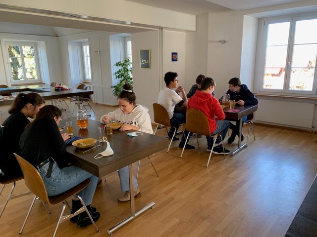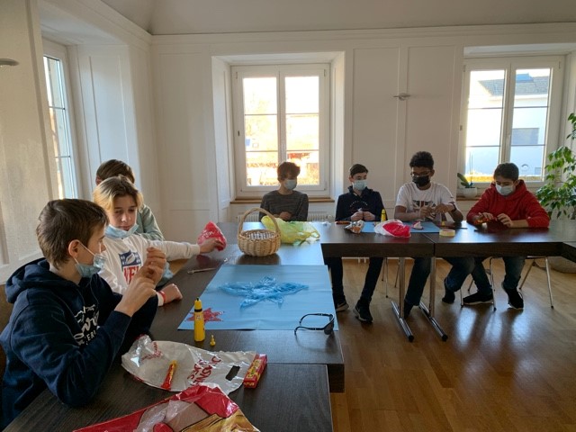 In Gruppen wurde mit Plastikmüll das maritime Thema «Plastik im Meer und in der Nahrungskette» bildnerisch gestaltet. Zwei Konfirmandinnen bereiteten für die ganze Gruppe das Menü zu, die Anderen halfen beim Auftischen und Aufräumen. "Mmmmmh", es hat allen richtig gut geschmeckt.
